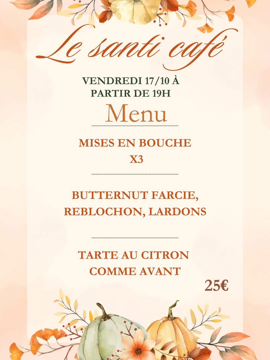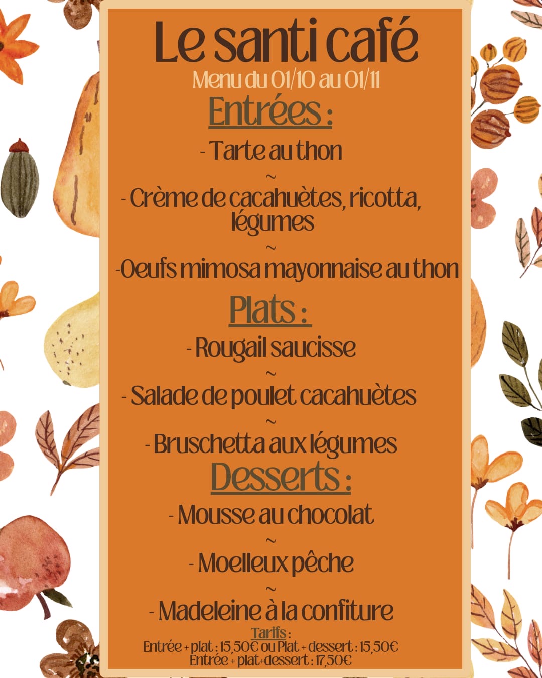 CALL +330562001799Le Santi café, c'est un lieu convivial à l'ambiance vintage et chaleureuse où nous vous accueillons pour déguster cafés, pâtisseries toute la journée, menu avec plat unique le midi, le lundi, mardi, jeudi, vendredi ainsi que des sandwichs le midi et dépôt de pain . Le weekend vous pourrez boire un verre au bar et manger des tapas le soir !